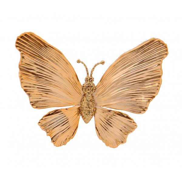 Adaugă un strop de eleganță decorului tău de sărbători cu acest fluture auriu metalic de 22 cm. Designul rafinat, cu detalii texturate și accente strălucitoare, îl face ideal pentru a împodobi bradul de Crăciun, coroanele festive sau aranjamentele de masă. Echipat cu un clip discret, fluturele poate fi ușor fixat pentru a aduce un aer sofisticat și festiv în orice colț al casei tale.