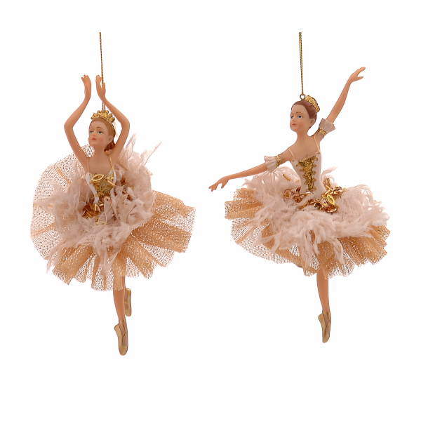 Adaugă un plus de eleganță decorului tău de Crăciun cu acest set de 2 balerine în nuanțe delicate de șampanie, îmbogățite cu accente subtile aurii. Cu o înălțime de 17.15 cm, aceste ornamente din polirășină sunt perfecte pentru decorarea bradului, aducând un farmec clasic și rafinat.