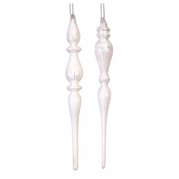 Adaugă un element elegant decorului tău de Crăciun cu acest set de 2 turturi albi, realizați din sticlă. Cu o lungime de 27 cm, acești turturi impresionează prin finisajul lor delicat și strălucirea subtilă. Sunt ideali pentru decorarea bradului sau pentru a aduce un strop de rafinament aranjamentelor tale festive.