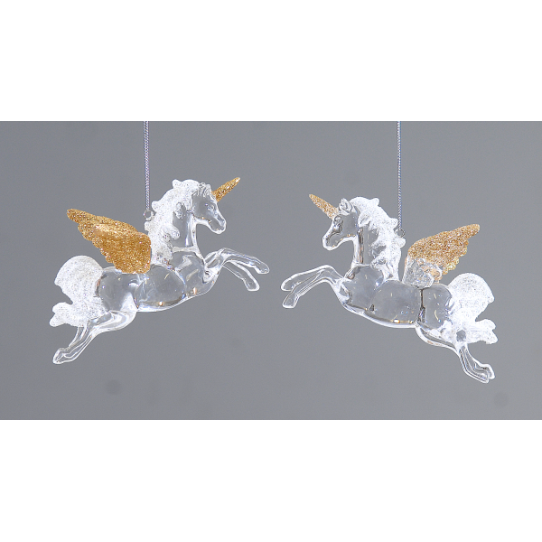Adaugă un strop de magie decorului tău de Crăciun cu acest set de 2 unicorni, fiecare cu detalii aurii pe corn și aripi. Cu o înălțime de 15 cm, acești unicorni din acryl sunt perfecți pentru a înfrumuseța bradul de Crăciun sau pentru a adăuga un accent festiv în orice colț al casei tale. Designul lor elegant și strălucitor aduce o atmosferă de vis sărbătorilor tale.